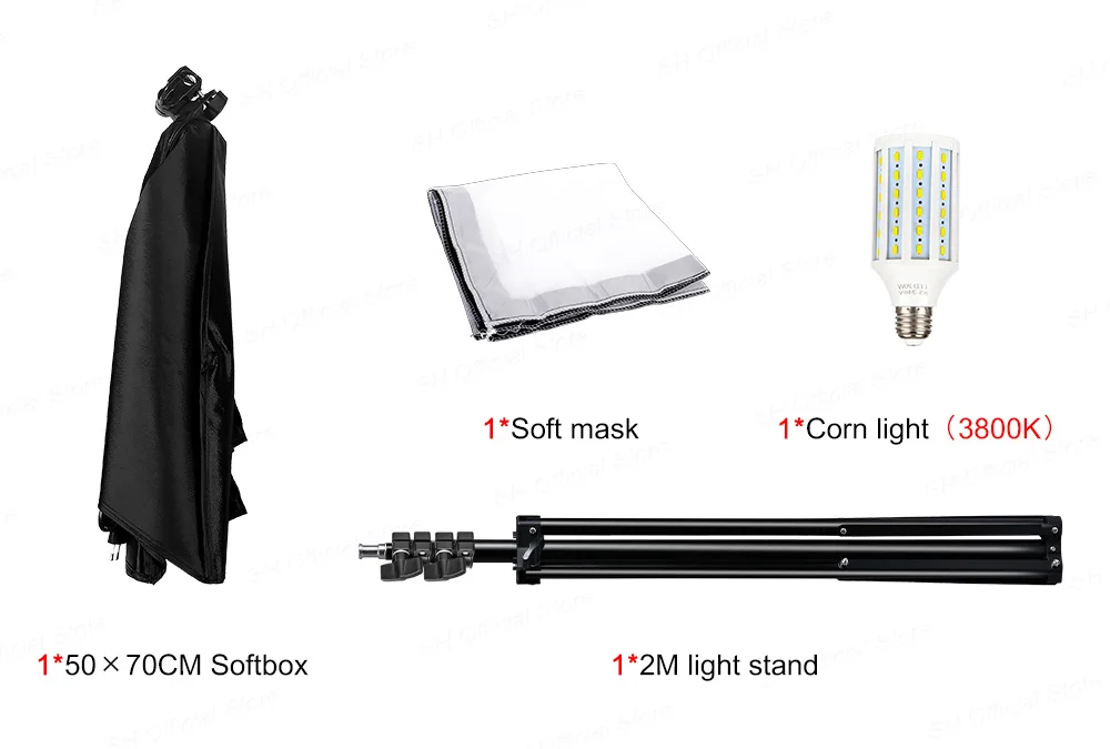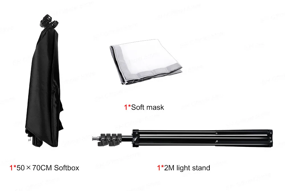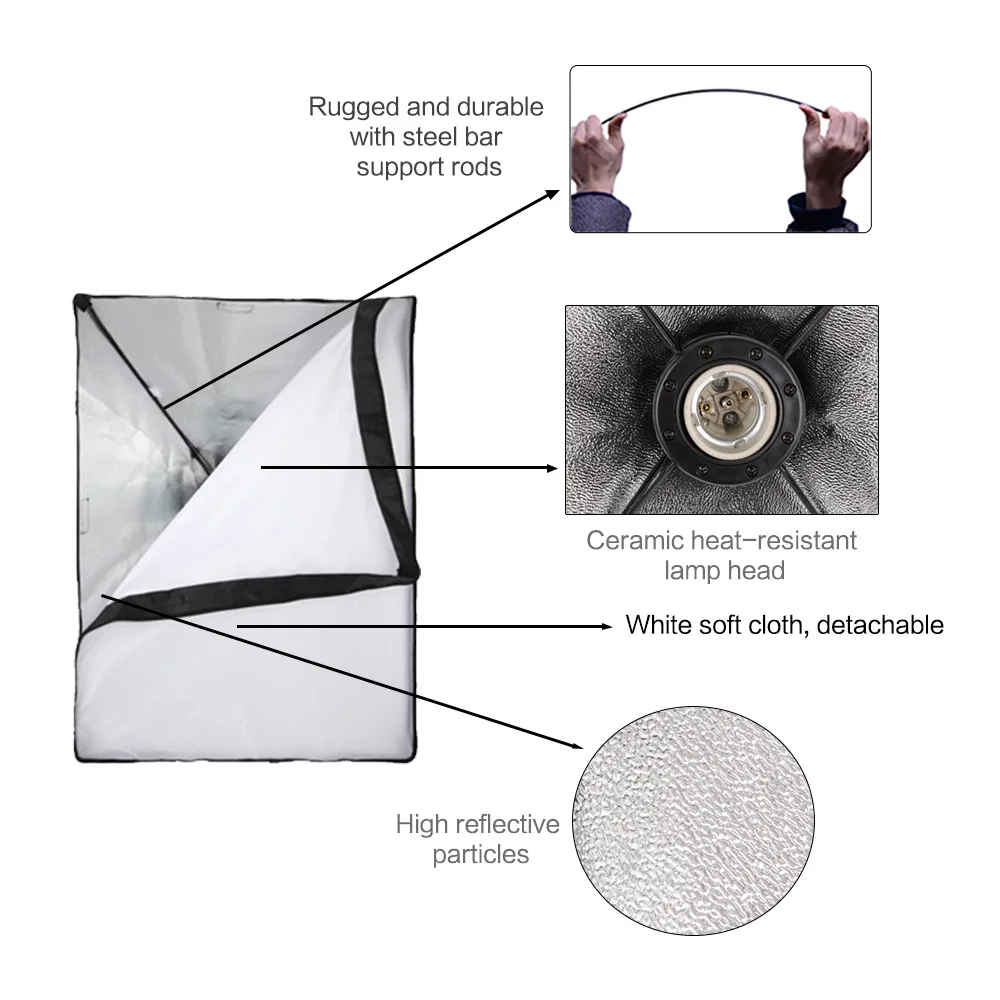 50x70CM single lamp head softbox:White foldable soft cloth,High quality reflective particle.Silver internal face to minimize light loss and maximize light spread. Safe and non-toxic polyester fiber,4 flexible connecting rods.